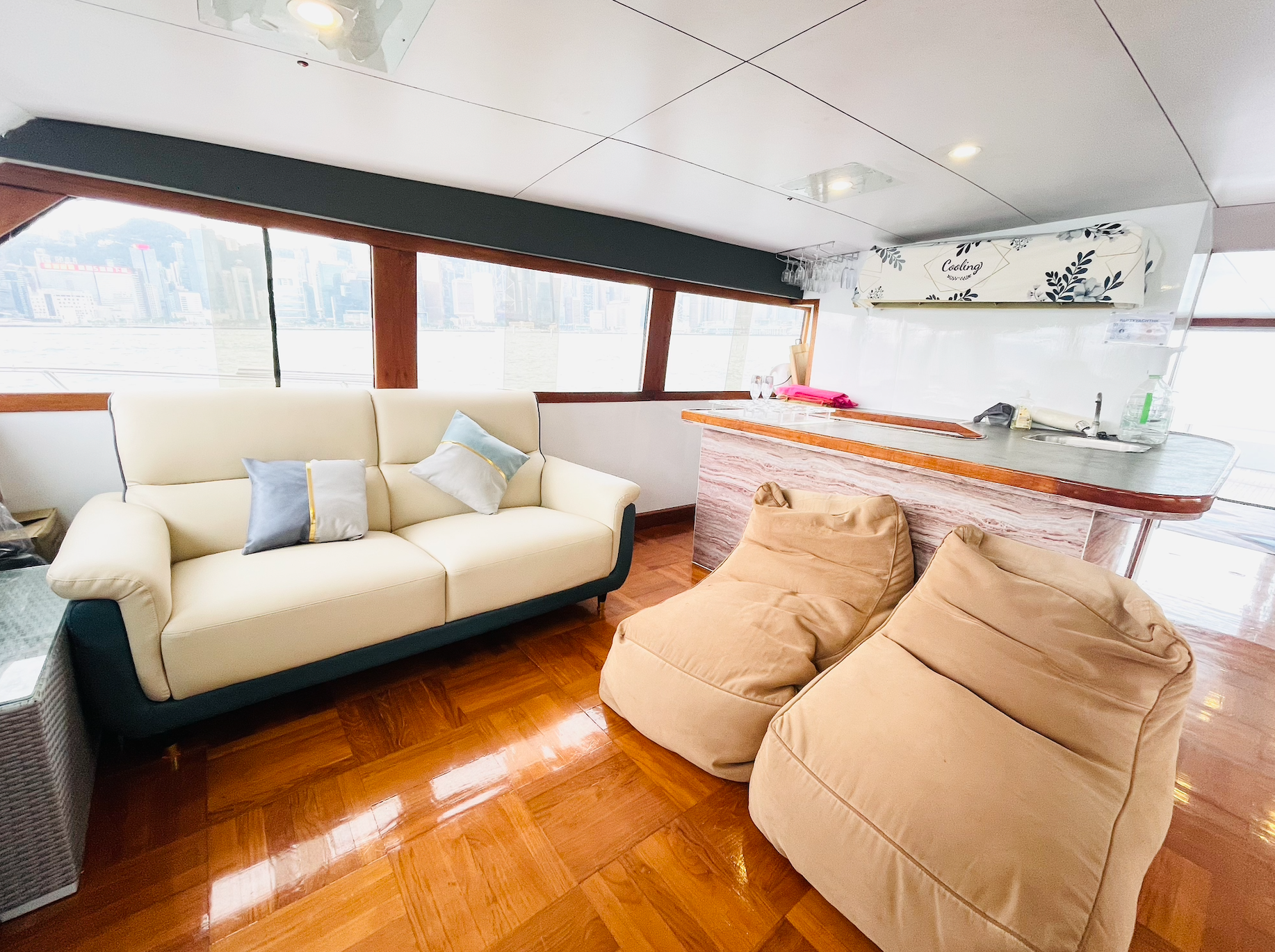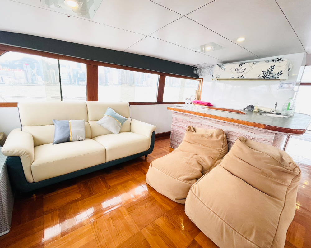 Her beautiful exterior and interior is stylish and she can bring you to cruise Hong Kong. Take her to catch perfect view of Hong Kong from all areas of the boat.